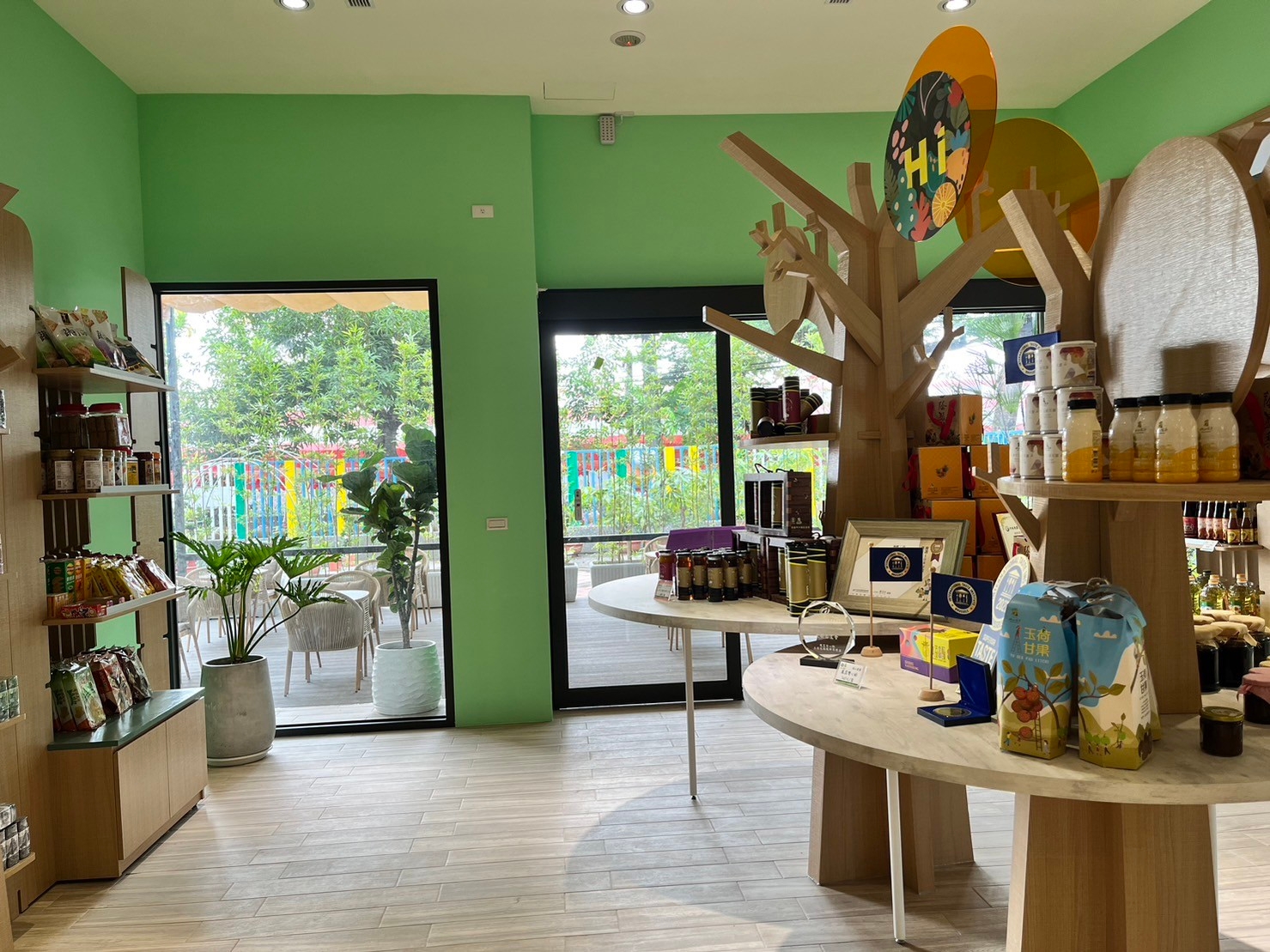 規劃作為鳳荔趣遊館的場域,是約94坪的挑高空間,進行整體形象與空間規劃時,已決定劃分為形象展示與商品展售兩空間。一道鮮黃的落地格子玻璃牆分隔動靜兩區,預想帶小孩來這旅遊的家長,可以把孩子放在展示那端的玉荷包祈福池裡玩耍,隔著一道玻璃坐在頗有情調的沙發座裡,喝著特調的玉荷包咖啡,也能分外安心。讓視野從室內到戶外格外通透。