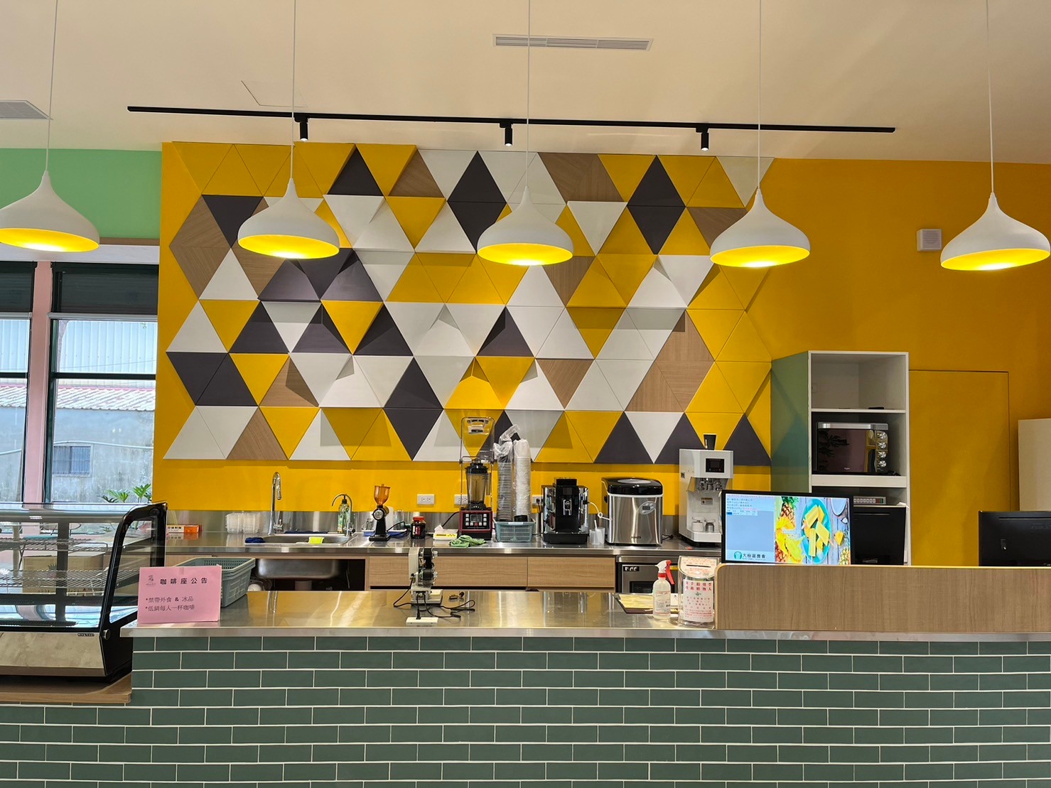 以雞蛋花配色吊燈搭配幾何三角吧檯背板,吧檯結合收銀、輕食飲品製作功能,側邊新開一道門通往後廚,提供未來出餐的合宜服務動線。獨立用餐區選用藤編綠絨布座椅搭配大理石紋桌面,周邊綠植盆栽營造空間氛圍。商品區則以樹型圓桌及立式貨架分別擺設主打及常售商品,樹型貨架來自玉荷包自樹摘採的概念,取下最精華的商品。