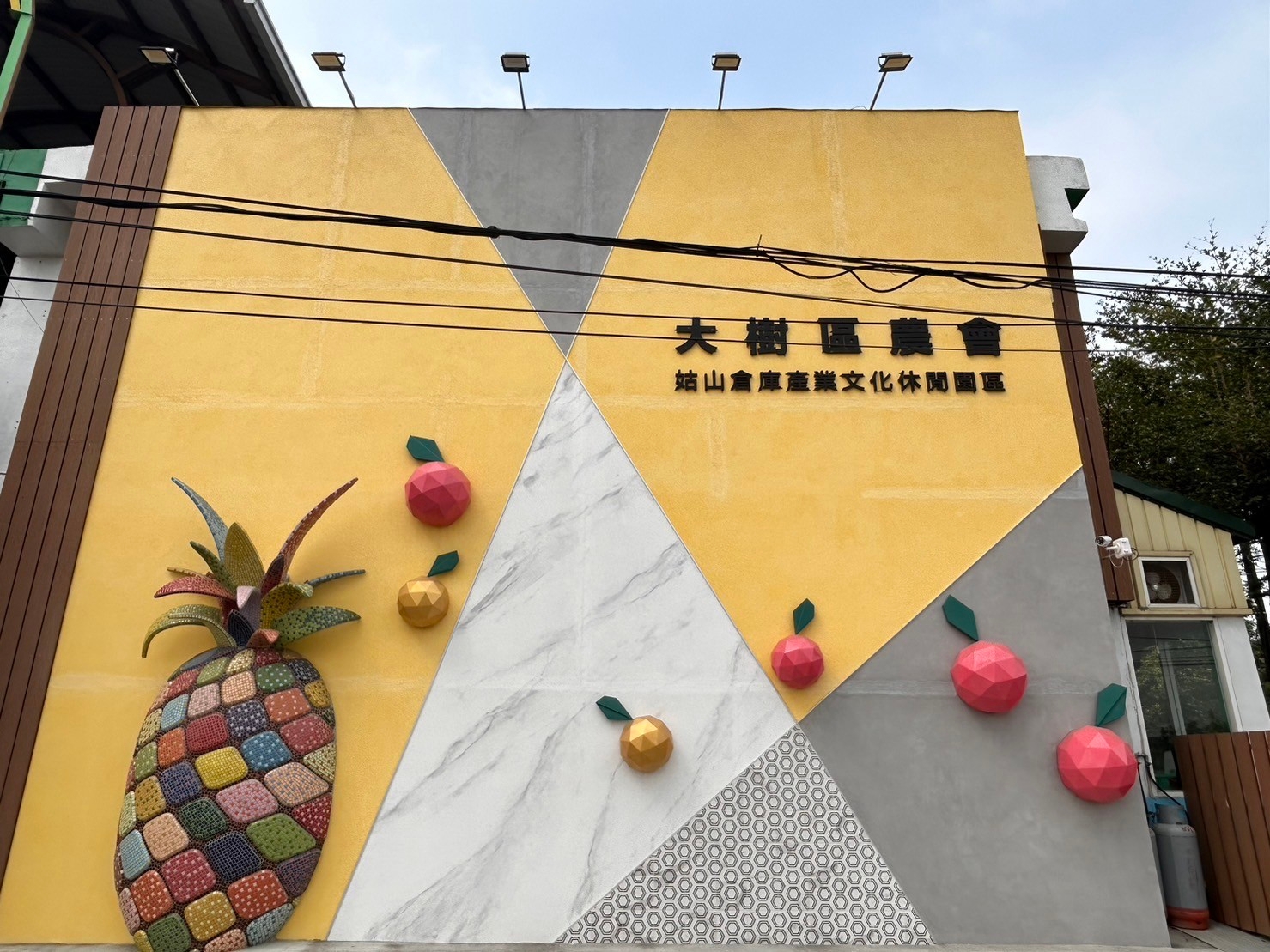 大樹區農會鳳荔趣遊館,初登場。從29省道進入姑山倉庫,五彩鳳荔與可愛的粉紅玉荷包以繽紛的藝術造型,宣告著新農村美學的嶄新一頁即將開始。