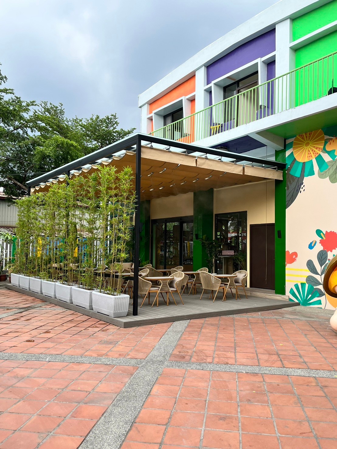 在落地窗邊的庭園裡設計一座天幕棚,讓室內外的視覺得以延伸,也提供遊客小歇之處。頂棚搭配噴霧器,用來對抗高雄灼人的日頭,側邊盆栽裡種一排挺拔的竹,增加些翠綠小竹林的風雅與閒適,隔離道路旁的行車匆匆。