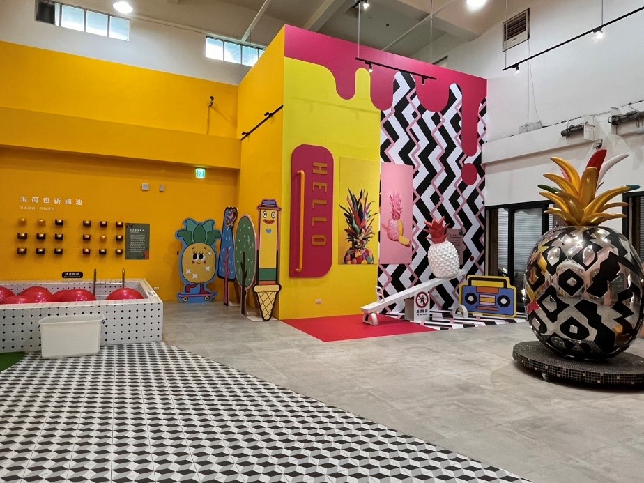 鳳梨作為大樹兩大特產之一,在鳳荔趣遊館裡正中是特別邀請藝術家邱泰洋為鳳荔趣遊館打造的金鑽意象,銀黑雙色的鳳梨果實體,頂著金、彩異色冠芽,襯著黑金馬賽克圓底盤,不鏽鋼手工切割拼貼的不規則銀色紋路亮的發光,像DISCO舞廳裡最耀眼的那顆彩球,在展示館裡熠熠生輝。一旁的蹺蹺板上安置著另一株鳳梨,粉頭白身,姿態像是從旱地拔起,配著全白的蹺蹺板與背景牆,把遊憩元素融入風格,創造一個趣味的美照打卡點。