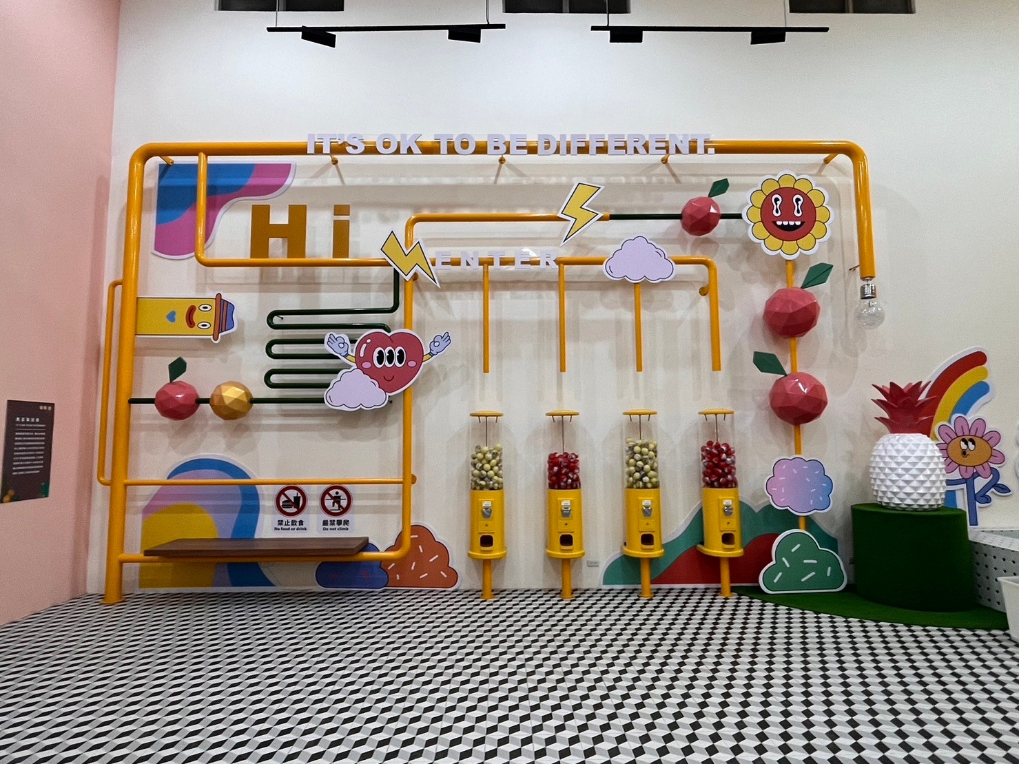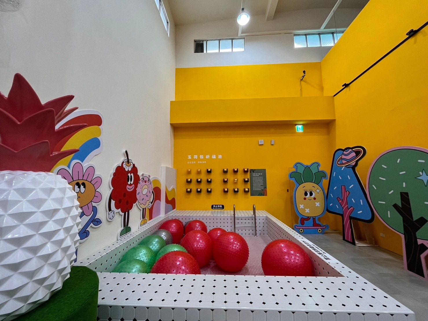我們判斷在鳳荔趣遊館裡展示碾米機,並不是塑造形象的加分項,但對業主頗為可惜的心態也能理解。農機沒有留下,可我們決定重新詮釋農業場景,「鳳荔製造機」由此而來。以鮮黃工業管線支撐農業製造場景,扭蛋機的互動會掉落圓滾果球,球裡是為鳳荔趣遊館的玉荷包與鳳梨兩位主角設計兩款微型積木公仔。是我們為一趟旅遊體驗裡添上的小巧思,除了拍美照與享用美食,也能帶走一個特色的紀念小玩具。