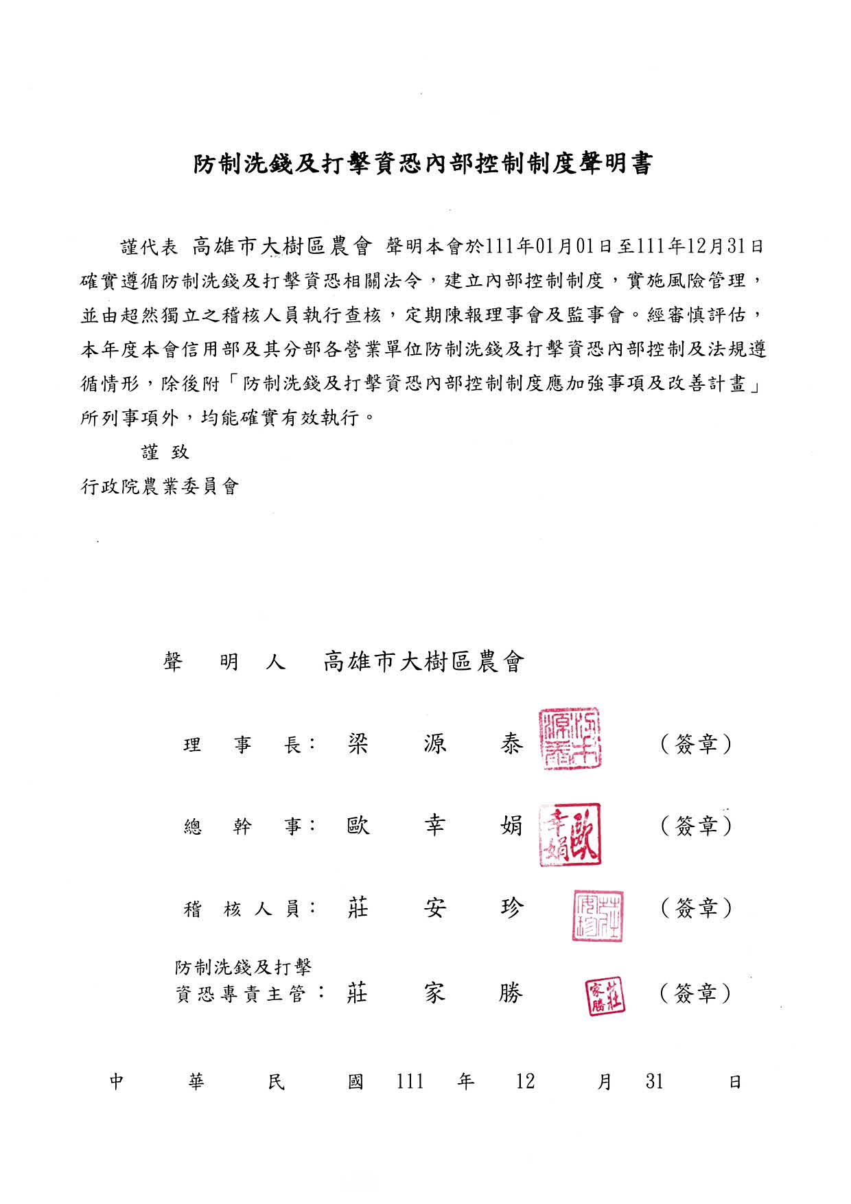 防制洗錢及打擊資恐內部控制制度聲明書1111231